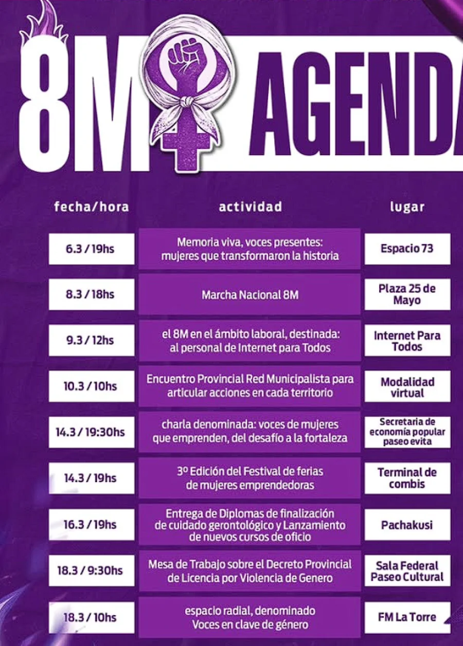 El 14 de marzo habrá dos actividades. A las 19:30 horas, en la Secretaría de Economía Popular (Paseo Evita), se brindará la charla “Voces de mujeres que emprenden, del desafío a la fortaleza”. Ese mismo día, a las 19 horas, se realizará la 3° edición del Festival de Ferias de Mujeres Emprendedoras en la Terminal de combis.