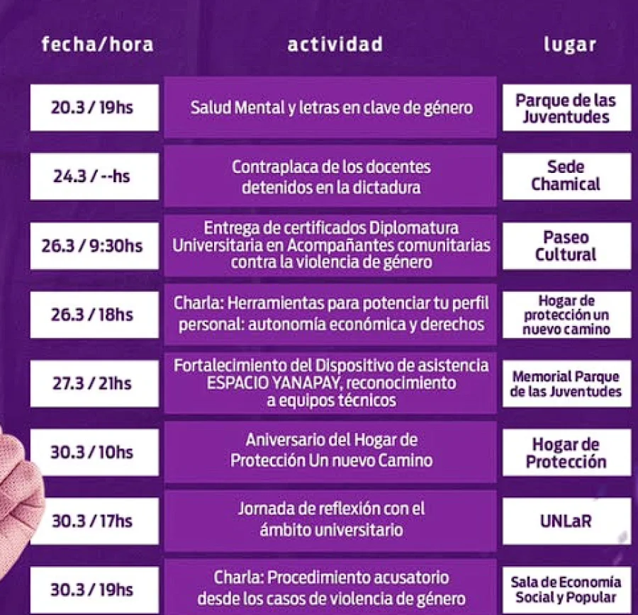 Finalmente, el 30 de marzo se llevarán adelante tres propuestas: a las 10 horas, el aniversario del Hogar de Protección Un Nuevo Camino; a las 17 horas, una jornada de reflexión con el ámbito universitario en la UNLaR; y a las 19 horas, en la Sala de Economía Social y Popular, la charla “Procedimiento acusatorio desde los casos de violencia de género”.